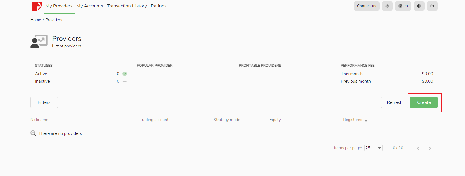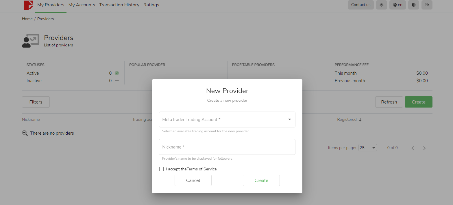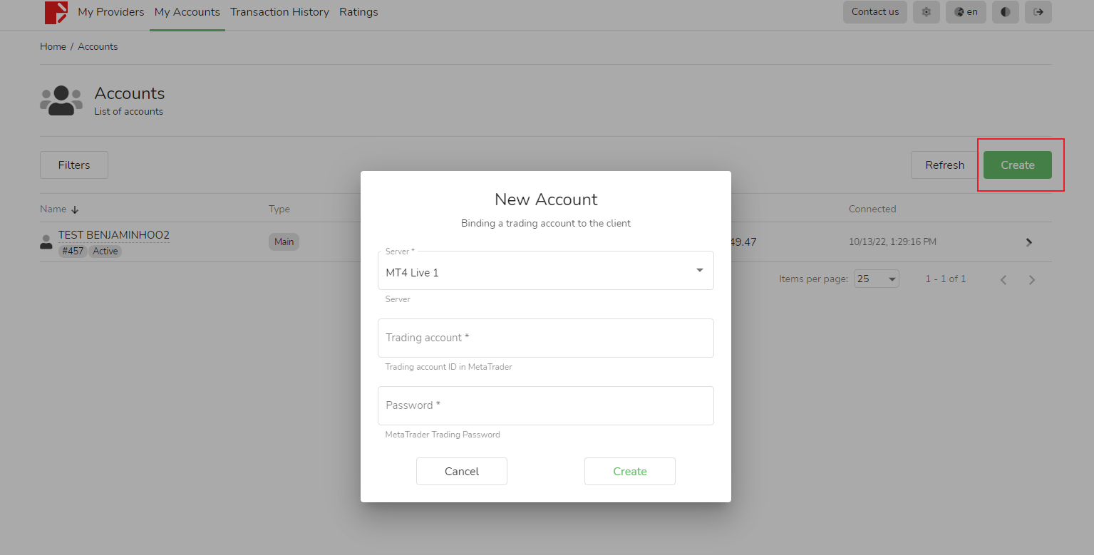في صفحة [حسابي] لمصدر الإشارة ، يمكنك إضافة حساب تداول جديد بالنقر فوق الزر الأخضر [إنشاء]. ومع ذلك ، لا يمكن استخدام هذا الحساب لتسجيل الدخول ، ويمكن اختياره فقط كمصدر إشارة أو متابع أو إعداد لتلقي رسوم الأداء.