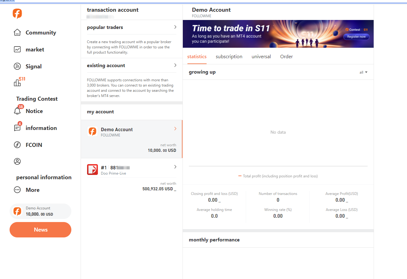 لا يمكن ربط حساب تداول MetaTrader 4 إلا بنفس حساب FOLLOWME. بعد نجاح الاتصال ، يمكنك النقر فوق "الملف الشخصي" على الجانب الأيسر من الصفحة الرئيسية ، وبعد ذلك سيتم إعادة توجيهك إلى صفحة الملف الشخصي لحساب FOLLOWME الخاص بك.