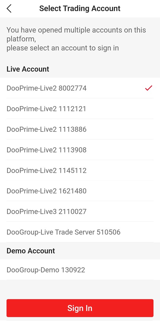 بعد ذلك قم باختيار الحساب الحقيقي أو الحساب التجريبي الذي فتحته حسب احتياجاتك الشخصية، ثم اضغط على "التالي" لبدء التداول مع D Prime InTrade.