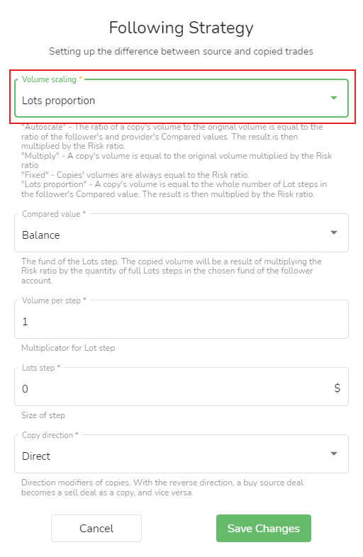 Copy trading volume lot = trading volume per step * (follower comparison value / lot step)