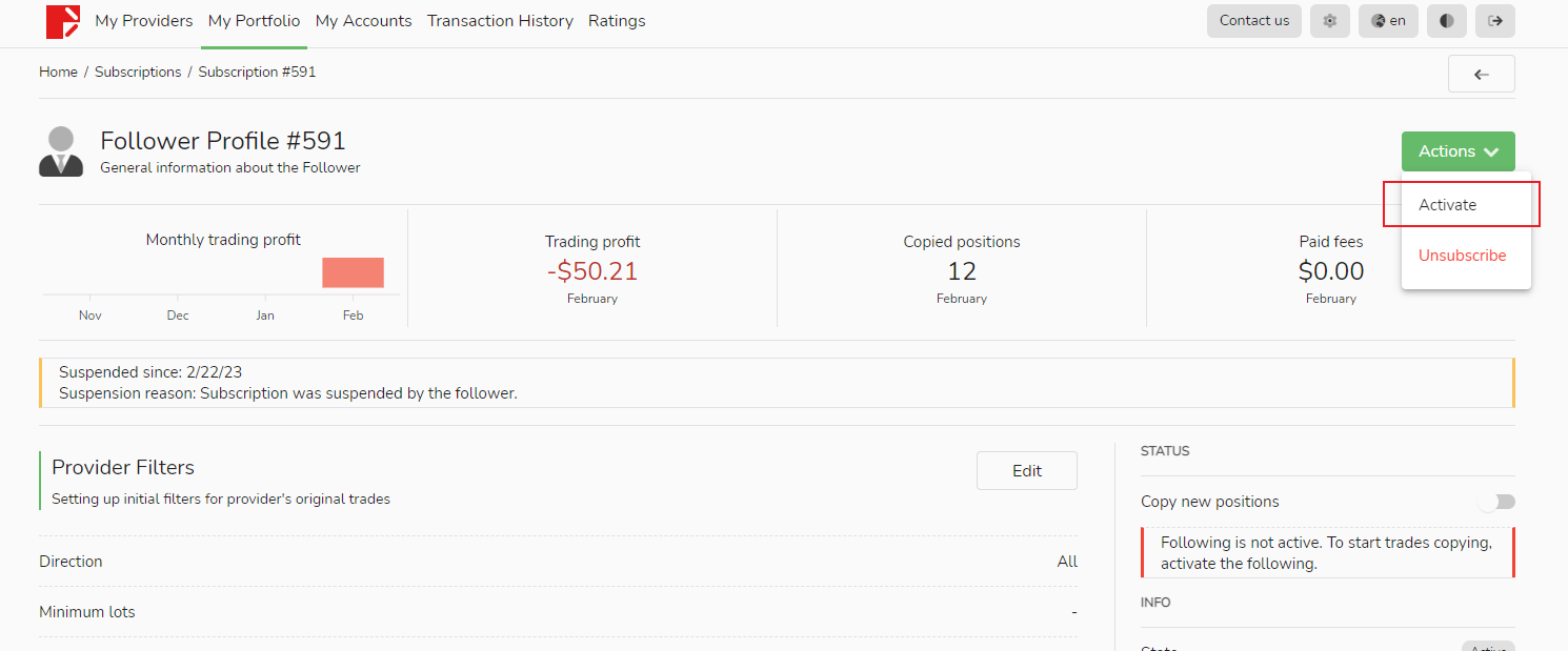 After completing the setting of the documentary account information, the follower needs to click the green [Activate] button, and the documentary conditions will come into effect.