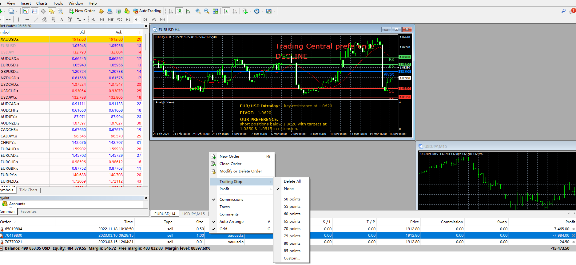For example, if the opening price of 1 lot is 1.00000 for a long EURUSD order, set a trailing stop loss of 100 points. When the price of the euro breaks through 1.00100, the trailing stop loss will be triggered. When the price of the euro falls back to 1.00100, the order will be stopped at 1.00100 implement.