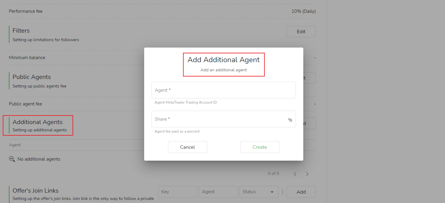 La fuente de la señal puede completar el [Código de identificación] después de hacer clic en [Agregar], configurar la [Validez] del enlace de unión y luego completar la cuenta comercial de MetaTrader del presentador y hacer clic en [Crear]. Tenga en cuenta: la cuenta comercial de MetaTrader de [Promoción de introducción] aquí se puede completar con éxito solo después de que se establezca el porcentaje de la tarifa de promoción de introducción.