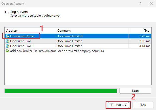 2.1 거래 서버 데모 또는 데모 2를 선택하고 "다음"을 클릭합니다.