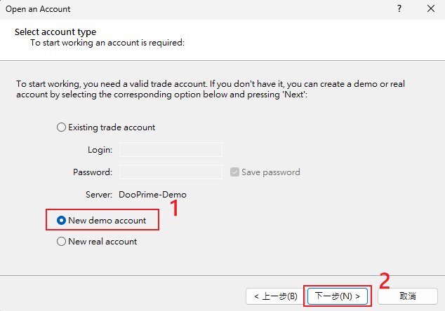2.2 "새 데모 계정"을 선택하고 "다음"을 클릭합니다.