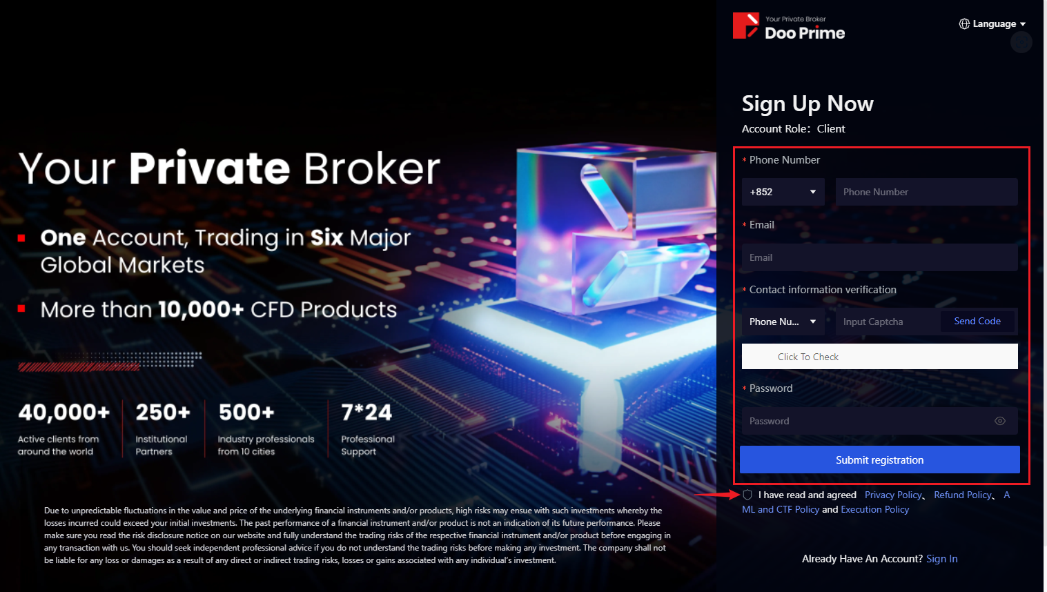 클라이언트 계약 및 위험 승인 및 공개의 이용 약관을 주의 깊게 읽고 기입된 정보가 사실이고 유효한지 확인한 다음 "클라이언트 서명"(병음)에 귀하의 성과 이름을 다시 입력하십시오. 이 법적 구속력이 있는 계약에 서명하는 데 동의한 다음 확인을 클릭합니다.