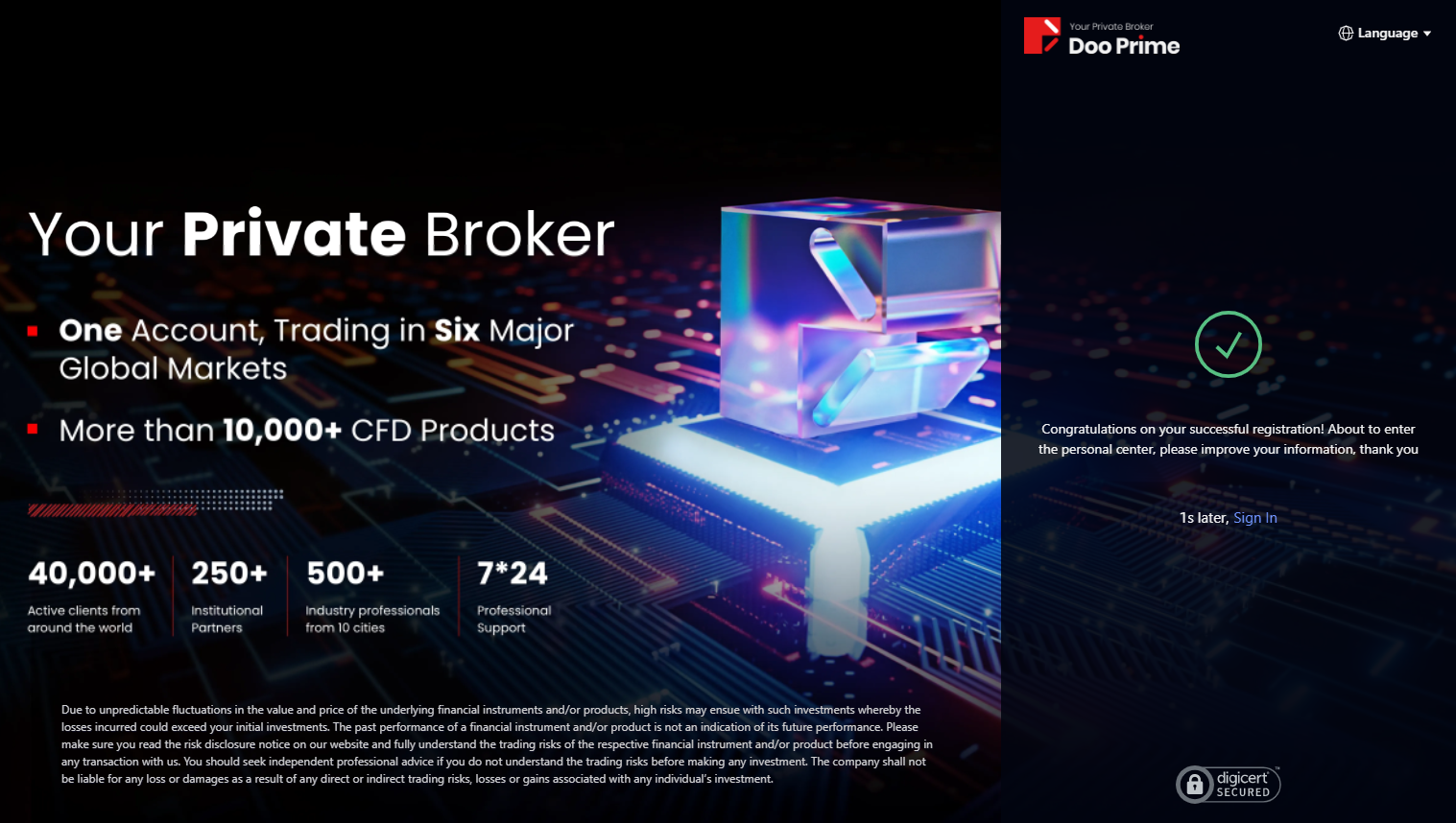 2.2 등록을 제출하면 등록이 성공적으로 완료되었다는 메시지가 나타납니다. 로그인을 클릭하시거나, 페이지가 자동으로 D Prime 사용자 센터로 이동될 때까지 3초간 기다려 주세요.