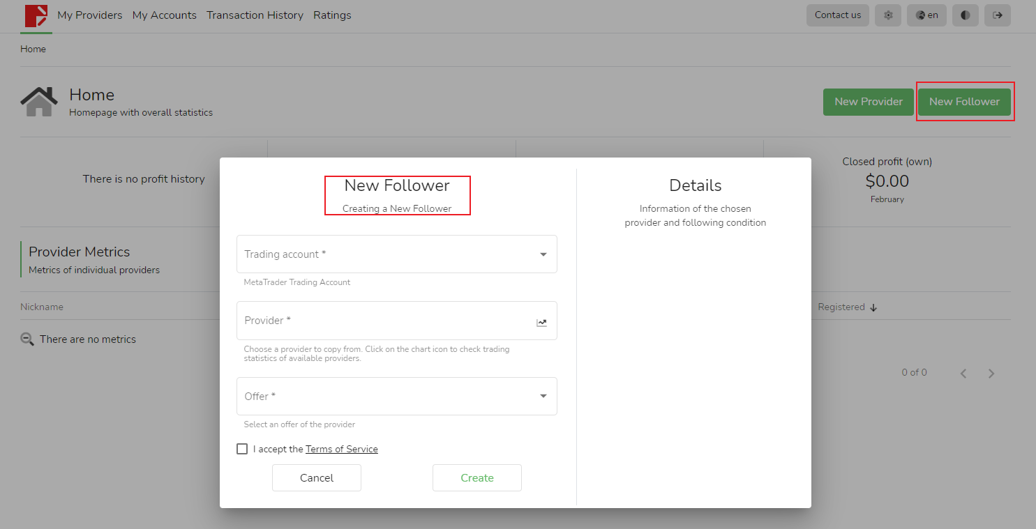 팔로워의 [내 계정] 페이지에서 녹색 [만들기] 버튼을 클릭하여 새로운 거래 계정을 추가할 수 있습니다. 단, 이 계정은 로그인에 사용할 수 없으며 시그널 소스, 팔로워로 선택하거나 실적 수수료를 받는 설정만 할 수 있습니다.