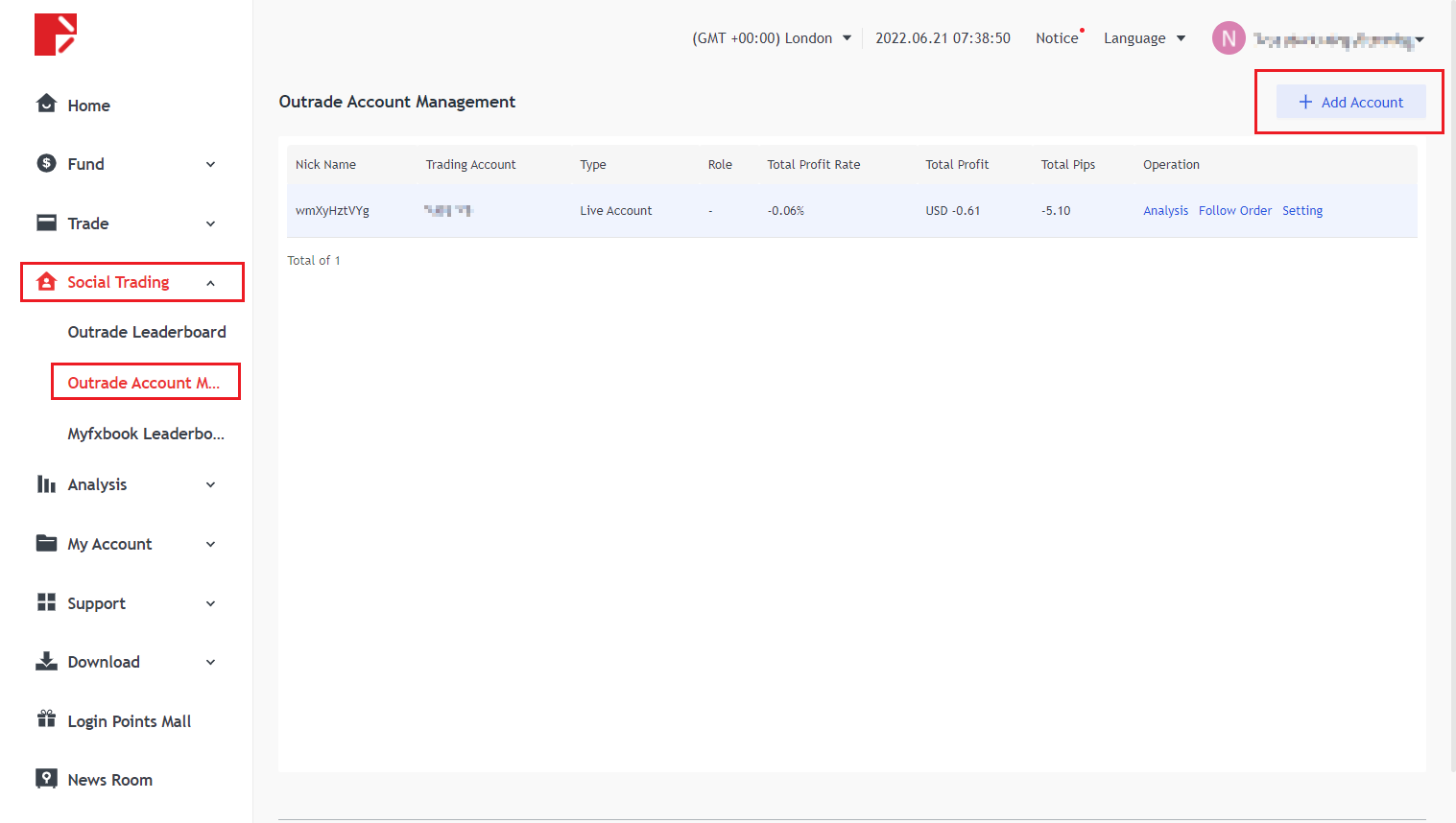 Doo Prime 사용자 센터에 로그인하고 홈페이지 왼쪽의 "커뮤니티 거래"를 클릭하고 "Outrade 계정 관리"를 클릭하고 페이지 오른쪽의 계정 추가를 클릭하고 "거래자" 또는 "팔로워" 역할을 선택합니다. , 마지막으로 Can 계정을 바인딩합니다.