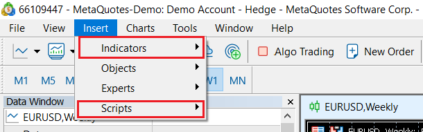 MT5에는 무려 38개의 테크니컬 인디케이터가 기재되어 있어 트레이더가 독립적으로 설정하여 언제든지 사용할 수 있으며, 메뉴바에서 [삽입]을 클릭하고 [삽입] 옵션에서 [인디케이터] 또는 [스크립트]를 선택합니다. 그런 다음 추가를 클릭하십시오.