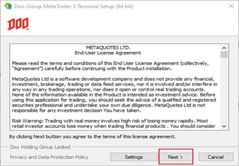 MT5 Windows 데스크톱 버전 다운로드가 완료되면 설치 가이드에 따라 그림의 [다음]을 클릭하여 설치를 시작합니다.