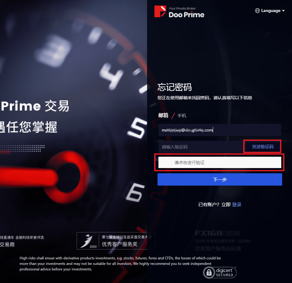 2. 選擇以郵箱或手機形式進行驗證,輸入相關資料後,點擊「發送驗證碼」,輸入郵箱或手機收到的驗證碼後,點擊「下一步」。
