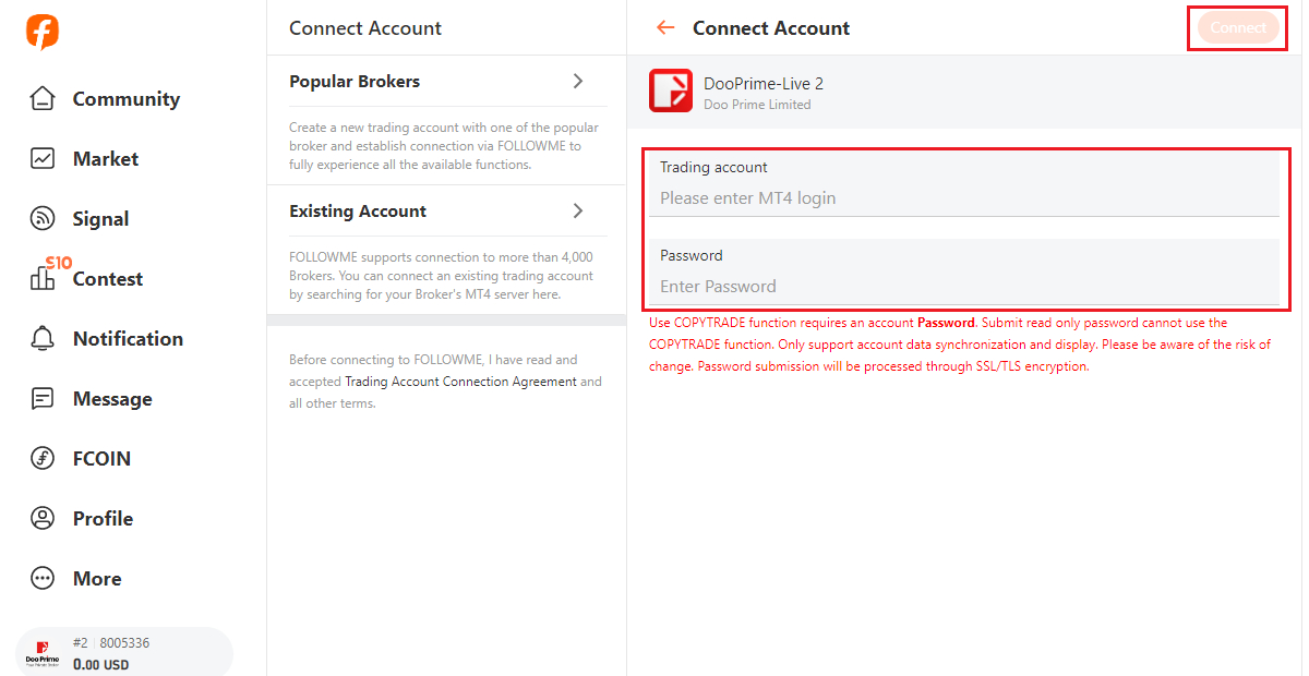 Làm thế nào để kết nối tài khoản giao dịch D Prime thông qua FOLLOWME?